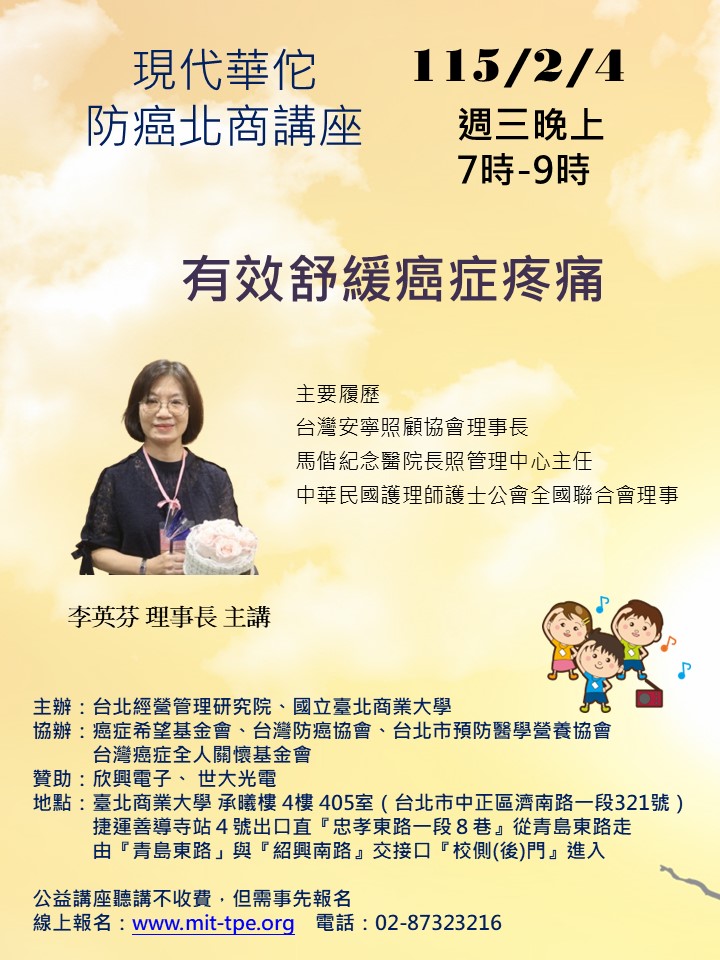 癌症希望基金會、台灣防癌協會、台北市預防醫學營養協會、台灣癌症全人關懷基金會